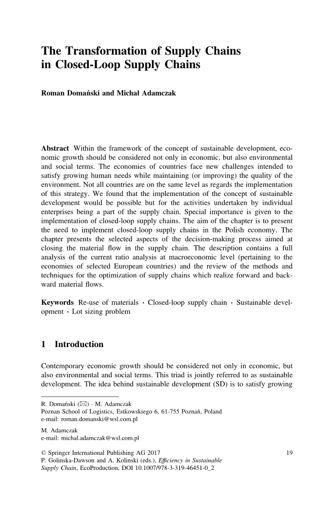 在可持续发展概念的框架内,经济增长不仅应考虑经济增长,还应考虑环境和社会条件因素。各国经济面临旨在满足日益增长的人类需求的新挑战,同时保持(或改善)环境质量。并非所有国家在实施该战略方面都处于同一水平。我们发现,如果不是个别企业作为供应链的一部分所进行的活动,就有可能执行可持续发展的概念。并且对闭环供应链的实施给予了特别的重视。本章的目的是提出在波兰经济中实施闭环供应链的必要性。本章的目的是提出在波兰经济中实施闭环供应链的必要性。本章介绍了旨在关闭供应链中的物流的决策过程的选定方面。该说明全面分析了宏观经济一级的现行比率分析(涉及选定的欧洲国家的经济),并审查了实现物质流动向前和向后的供应链的优化方法和技术。