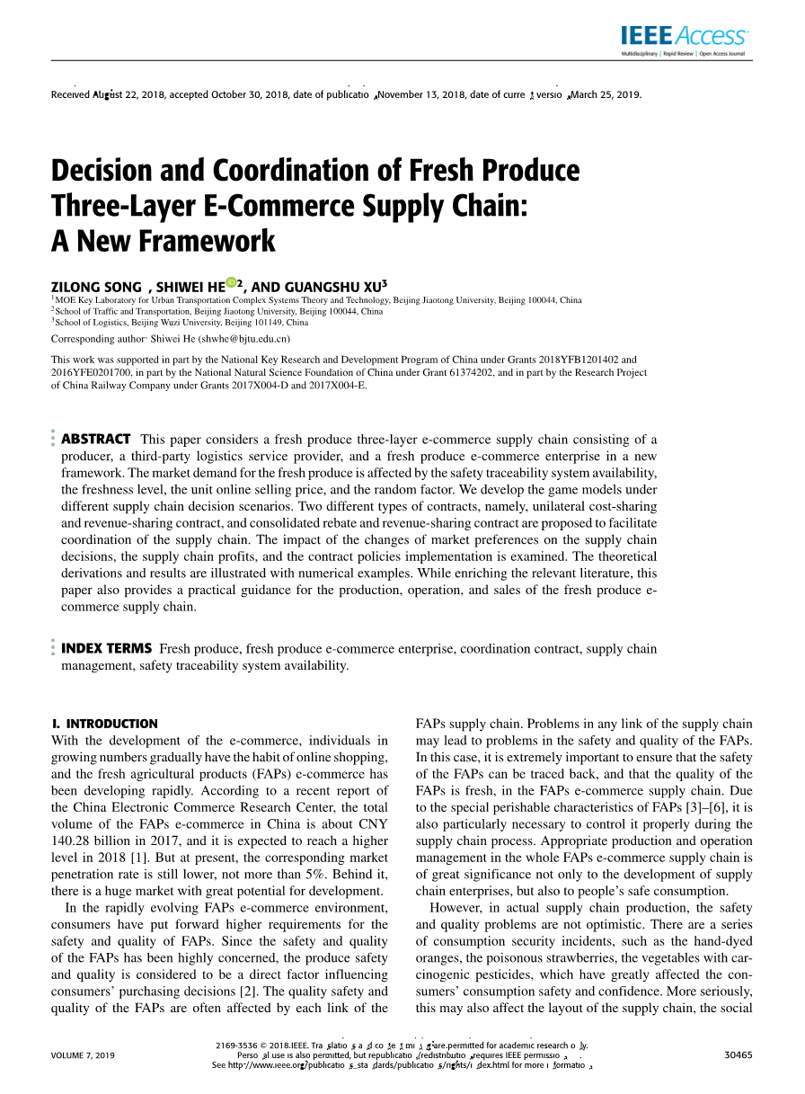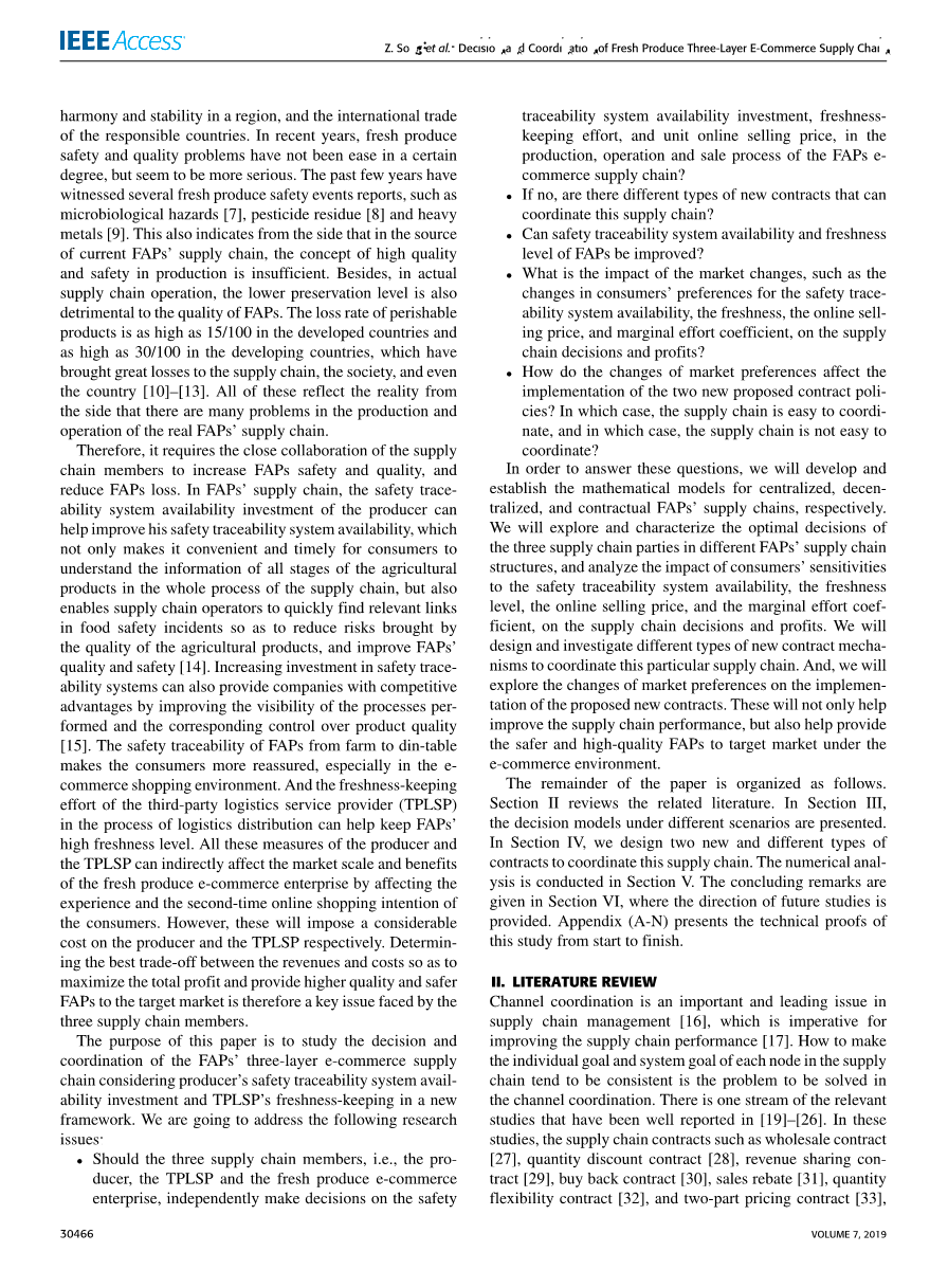 在回顾关于多层FAPs电子商务供应链协调的文献时,我们发现对于多渠道成员之间的FAPs供应链协调的研究相对较少,部分原因是可能的合同相关的困难。据我们所知,只有少数学者考虑过与两个以上FAPs供应链参与者的协调契约。例如,Cai等人[41]提出了一个多通道成员的供应链,发现批发市场清仓和批发价格折扣共享契约可以降低运输和销售过程中的风险。Fenget al.[42]考虑了一个三层供应链,并开发了一个供应商主导的博弈模型。在此基础上,设计了一个复合契约来实现供应链的协调。这些学者的著作给了我们很大的启发。然而,他们的作品只考虑了一种契约合作机制,没有电子商务背景。而且他们没有考虑到安全追溯系统的可用性、新鲜度和网上销售价格敏感的随机需求。我们的模型将研究在安全可追溯系统可用性、新鲜度和在线销售价格敏感随机需求下,不同类型的合同对协调所提出的FAPs电子商务供应链的影响。