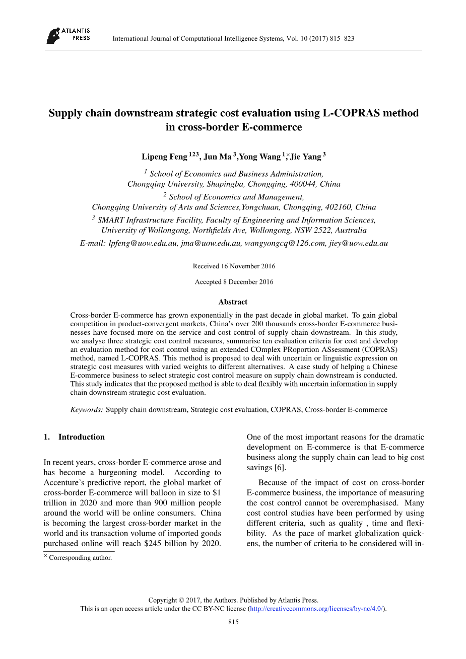 近年来,跨境电子商务应运而生,并已成为一种新兴模式。根据埃森哲的预测报告,2020年,跨境电子商务的全球市场规模将激增至1万亿美元,全球将有超过9亿人成为在线消费者。中国正在成为世界上最大的跨境市场,其网上购买的进口商品交易额将在2020年达到2450亿美元。电子商务如此戏剧性的发展最重要的原因就是供应链上的电子商务会节约大量的成本。由于成本对跨境电子商务的影响,衡量成本控制的重要性怎么强调都不为过。许多成本控制研究都是通过使用不同的标准,如质量、时间和灵活性来进行。随着市场全球化步伐的加快,需要考虑的标准数量将会增加。随着标准的增加,定性和定量标准同时出现的机会肯定会更大。因此,必须使用一种能够同时评估定性和定量标准的方法。COPRAS是一种众所周知的多标准决策问题的方法。在本研究中,我们改进了标准COPRAS方法,以满足跨境电子商务供应链下游战略成本控制中定性和定量标准的要求。这种新方法被称为L-COPRAS,它提供了一种更灵活的方法来解决现实世界中的评估问题。此外,本研究侧重于关于单独分配权重的战略成本控制措施。这个应用程序以前很少尝试。