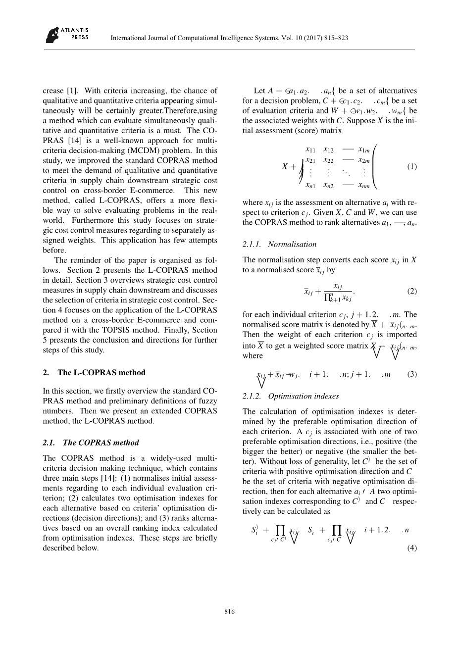 本文的提醒安排如下。第二节详细介绍线性COPRAS方法。第三节概述了供应链下游的战略成本控制措施,并讨论了战略成本控制标准的选择。第4节重点介绍了L-COPRAS方法在跨境电子商务中的应用,并与TOPSIS方法进行了比较。最后,第五部分提出了本研究的结论和进一步研究的方向。
