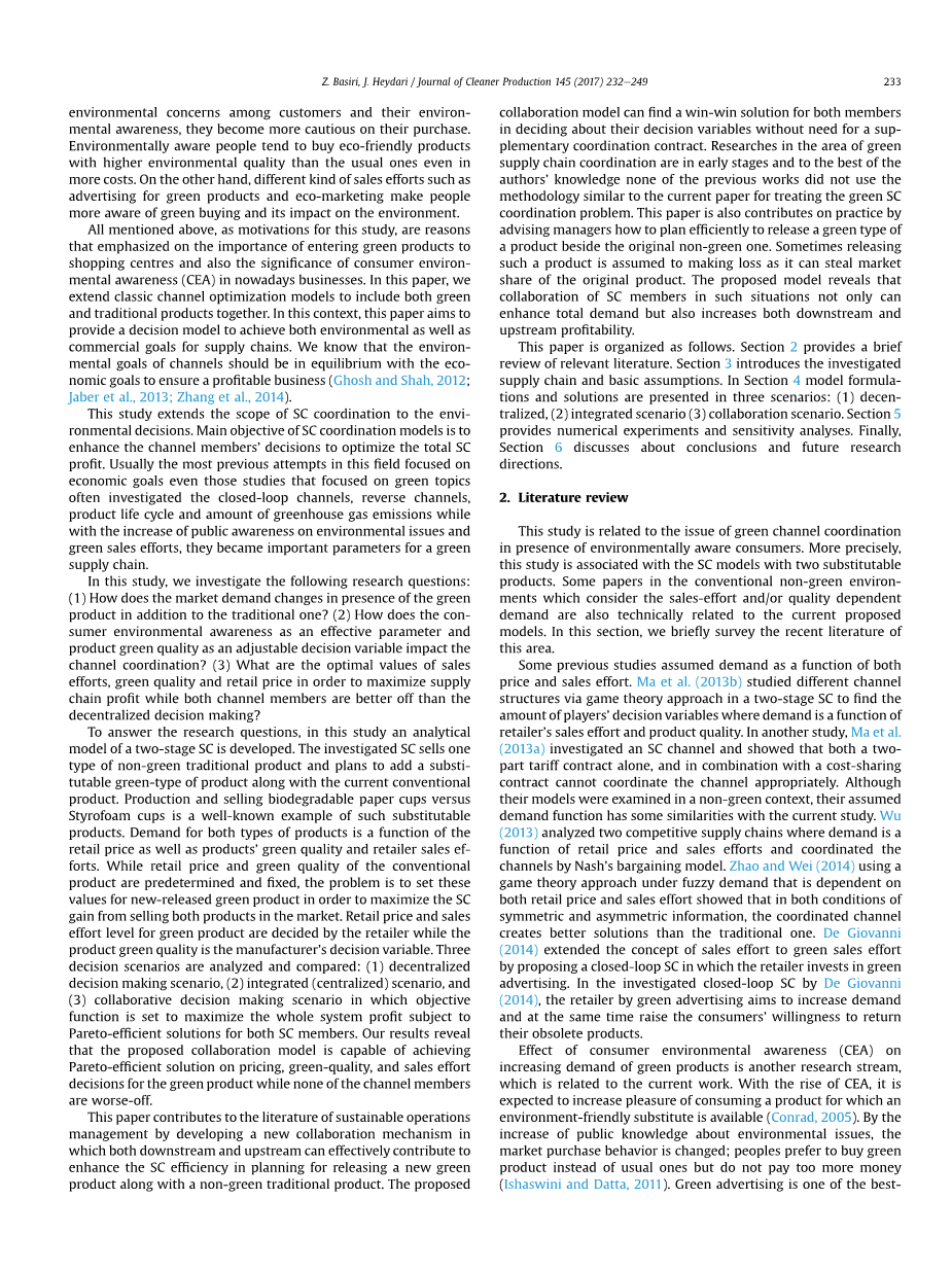 摘 要本文研究了二级绿色供应链协调问题。所研究的供应链销售一种非绿色传统产品,并在其基础上增加一种新的可替代绿色产品。消费者对这两种产品的需求取决于零售价格以及产品的绿色度和零售商的销售努力。绿色产品的零售价格和销售努力水平都由零售商决定,而产品绿色度是由制造商决定的。本文对三种决策情形进行了建模和比较:(1)每个成员根据自己的利润独立进行决策的分散模型;(2)只存在一个决策者的集中决策模型;(3)提高供应链的利润并且不损害各成员利益而实现帕累托改进的收益共享模型。本文给出了前两种情况下最优零售价格、销售努力和绿色度的表达式,并建立了合作场景下的数学规划模型。我们的数值研究表明,所提出的协调模型能够使供应链利润与集中决策模型相当接近,并确保双方成员都能比分散决策时获得更高的利润。关键词 绿色供应链协调;可替代产品;消费者环境意识;环境质量;销售努力;协同决策1 引言在过去的几年里,经济的快速增长和消费者的过度使用已经影响了全球的生态系统(Chen and Chai,2010)。气候变化、全球变暖、臭氧层空洞、海平面上升、噪音、空气和水的污染、酸雨和土壤侵蚀都是环境退化产生的结果 (Ramlogan, 1997)。如果当前不科学的经济增长模式继续下去,环境退化将会越来越严重 (Ishaswini and Datta,2011)。另一方面,近几十年来,环境问题也引起了公众的广泛关注。越来越多的人意识到有害活动对供应链规划和运作产生了重大影响。 因此,如何减少环境危害以获得显著的竞争优势,改善供应链的公众形象成为现代供应链中的一个重要问题(Govindan et al.,2014a)。此外,环境问题给竞争激烈的商业环境增加了更多的复杂性,即除了获取供应链的经济效益外,还要制定一些环境目标。碳排放减少,逆向供应链,产品生命周期考虑,以及绿色产品的生产,都是现代供应链围绕环境努力后的成果。有大量证据表明,环境问题是政府和工业界共同关心的主要问题 (Govindan et al.,2014b)。国际组织和各国政府相应制定了今后10至50年的温室气体减排目标。例如,欧盟计划到2020年削减20%,英国的气候变化法案计划到2050年削减80%。英国零售商如ASDA、Tesco、Mamp;S和Debenhams通过在原材料供应、生产和物流等方面采取一些措施,以减少所在业务活动中的碳足迹。Wal-Mart和Tesco则坚持要求制造商降低生产和运输中的碳排放水平(Ramanathan等,2014)。与此同时,近年来,环境问题引起了消费者的广泛关注。美国环境保护局(EPA)鼓励消费者购买环保产品,并为每个人提供在线碳足迹计算器。同时引入一些环保标签来引导消费者选择购买绿色产品(Teisl et al.,2002; Du et al., 2016)。随着消费者对环境问题的日益关注和环保意识的增强,他们在购买时变得更加谨慎。有环保意识的人更倾向于购买环保产品,这些产品的环境质量比普通产品要高,同时成本也更高。另一方面,不同的销售努力,如绿色产品广告和生态营销,使人们更多地意识到绿色购买的重要性及其对环境的影响。以上所述,作为本研究的动机,都是强调在如今的商业环境中绿色产品进入购物中心的重要性以及消费者环保法规制定的重要性的原因。本文将经典的供应链优化模型推广到绿色产品和传统产品。在此背景下,本文旨在为供应链的环境目标和商业目标的实现提供一个决策模型。正如我们所了解的,供应链的环境目标应该与经济目标保持平衡,以确保企业盈利(Ghosh and Shah,2012;Jaber等., 2013;Zhang等,2014)。本文将供应链协调的范围扩展到环境决策。供应链协调模型的主要目标是增强供应链成员的决策能力,使供应链总利润达到最优。通常,这一领域的大部分尝试都集中在经济目标上,即使是那些关注绿色主题的研究,也往往会对闭环通道、反向通道、产品寿命进行研究。温室气体排放的周期和数量将随着公众对环境问题的认识和绿色销售努力的提高,成为绿色供应链的重要参数。在本文中,我们讨论了以下几个研究问题:(1)传统产品和绿色产品同时存在的情形下,市场需求如何变化?(2) 作为有效参数的消费者环境意识和作为可调决策变量的产品绿色度将如何影响供应链协调?(3)当供应链利润最大时,销售努力、绿色度和零售价格的最优值是什么,且供应链中的两个成员的利润是否都比分散决策情形下的更优?为了解决这些问题,本文建立了基于两阶段供应链的分析模型。该供应链成员制造和销售一种非绿色传统产品,并在现有传统产品的基础上增加一种可替代的绿色产品。生产和销售可生物降解纸杯与泡沫塑料杯是此类可替代产品的比较普遍的例子。消费者对这两种产品的需求数量取决于零售价格以及产品的绿色度和零售商的销售努力。虽然传统产品的零售价和绿色度是预先确定和固定的,但问题是如何确定绿色产品的零售价和绿色度,使供应链通过在市场上出售这两种产品来获得最大的利润。绿色产品的零售价格和销售努力水平由零售商决定,而产品绿色度是由制造商决定的。下面我们将对三种决策情形进行分析和比较:(1)分散决策模型;(2)集中决策模型;(3)为了实现供应链利润最大化同时不损害供应链各成员利润即帕累托改进而建立的收益共享模型。最后的结果表明,所提出的收益共享模型能够在绿色产品的定价、绿色度和销售努力决策的基础上实现帕累托改进,供应链各成员的利益
