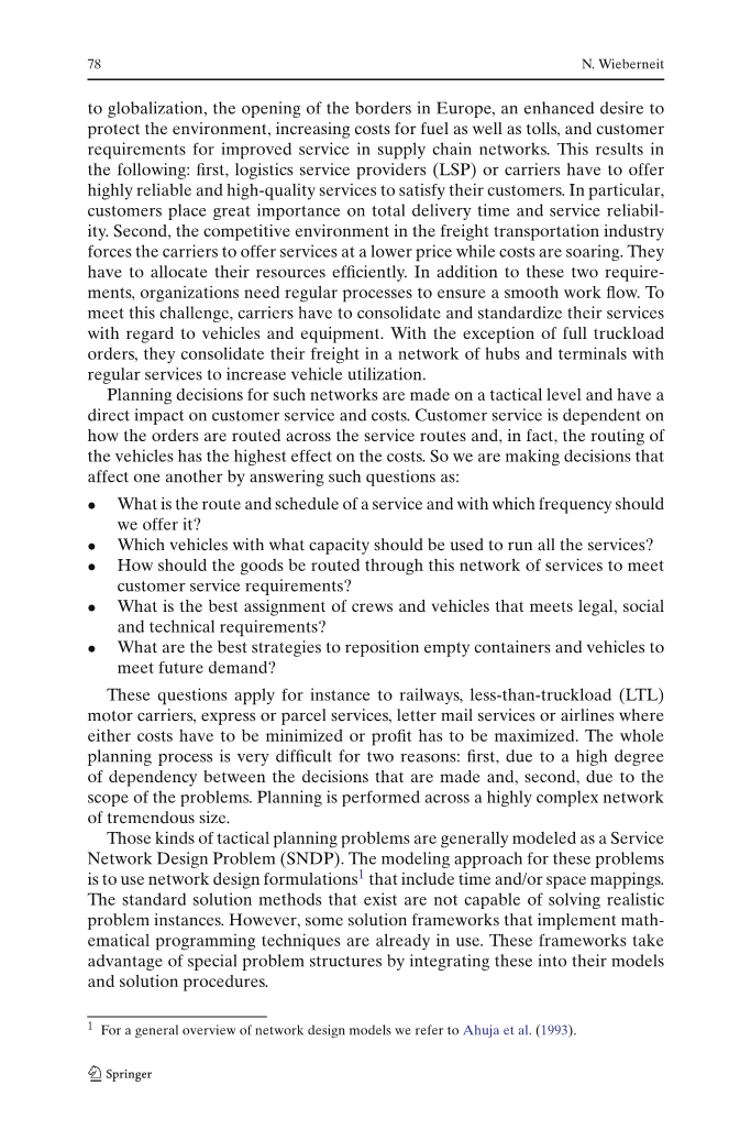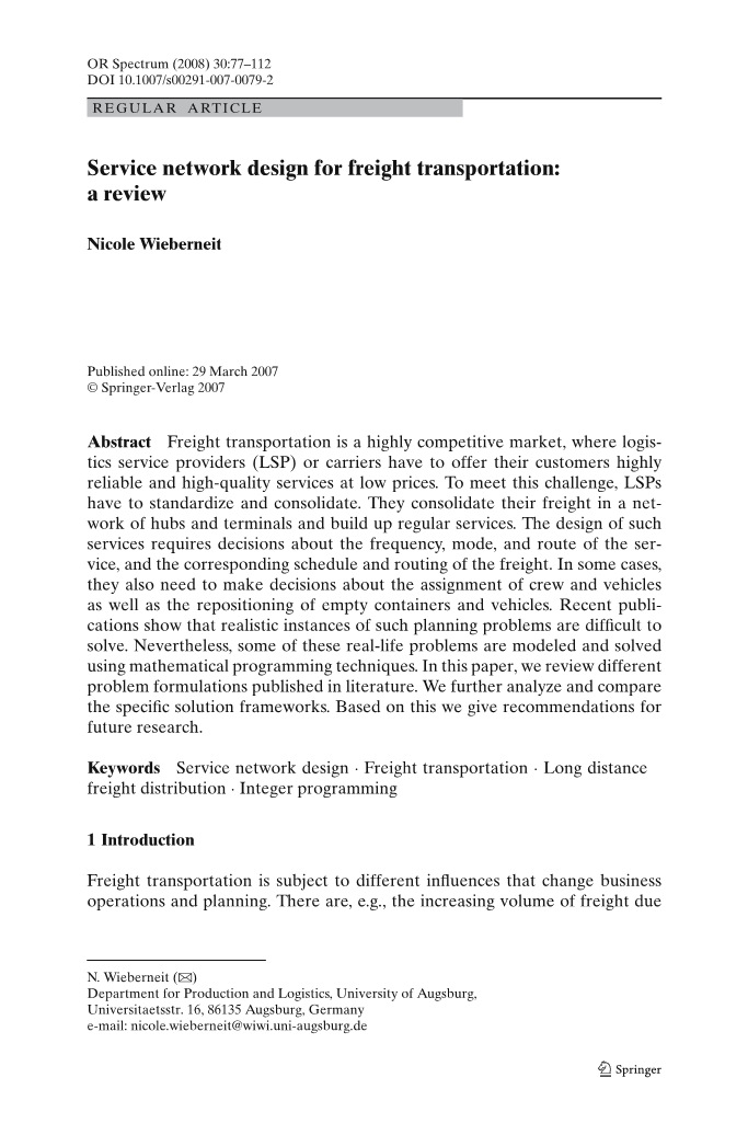 本文的结构如下:在第二节,我们简要回顾了货运中的SNDP以及相关的分类。第三节里考虑了文献中提出的五个战术规划问题的真实案例,还回顾了所描述问题的不同建模概念和相应的解决方法。第四节中对未来发展提出了展望。