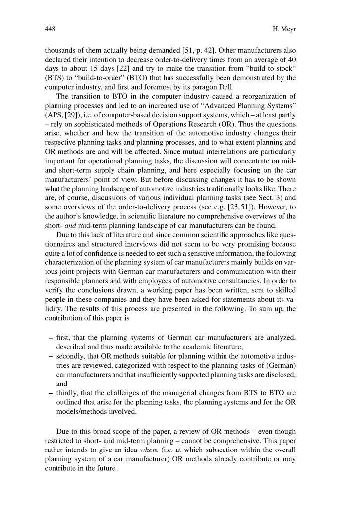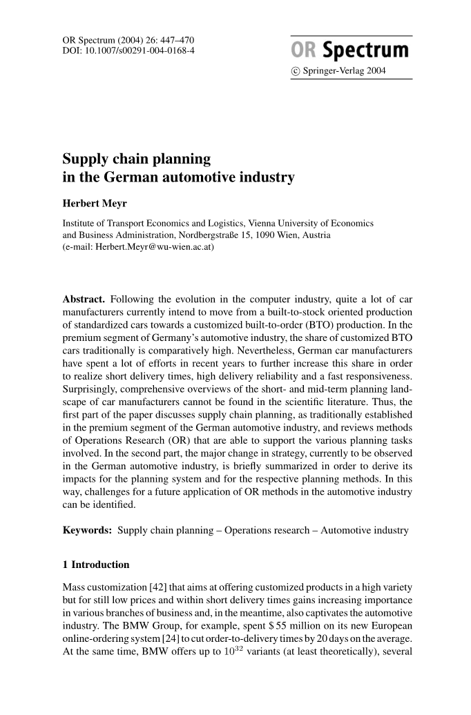 为了理解汽车计划系统是这样组织的原因,第二部分描述了汽车供应链的特点。世界不同地区(北美、日本、韩国、欧洲德国)的汽车制造商在不同的细分市场上运营的情况有很大差异。本文主要关注高端品牌(如宝马、奔驰、奥迪),而非豪华车(如劳斯莱斯、迈巴赫、宾利)以及德国汽车业。尽管如此,这篇论文中的许多陈述可以使用于世界其他地区的汽车制造商那里,解决相关的产品细分问题,因为(即使从不同的起点开始),他们中的许多人同样打算转向订单订制生产。第3部分介绍了传统的中短期规划系统,并在介绍了相应的规划任务后,指出了适当的规划和运筹学方法。在简要总结了德国汽车工业目前正在实施的改进面向订单订制措施后,它们对规划系统的影响会在第五部分中讨论。因此,可以得出规划方法的变化要求,并最终确定未来研究的挑战。
