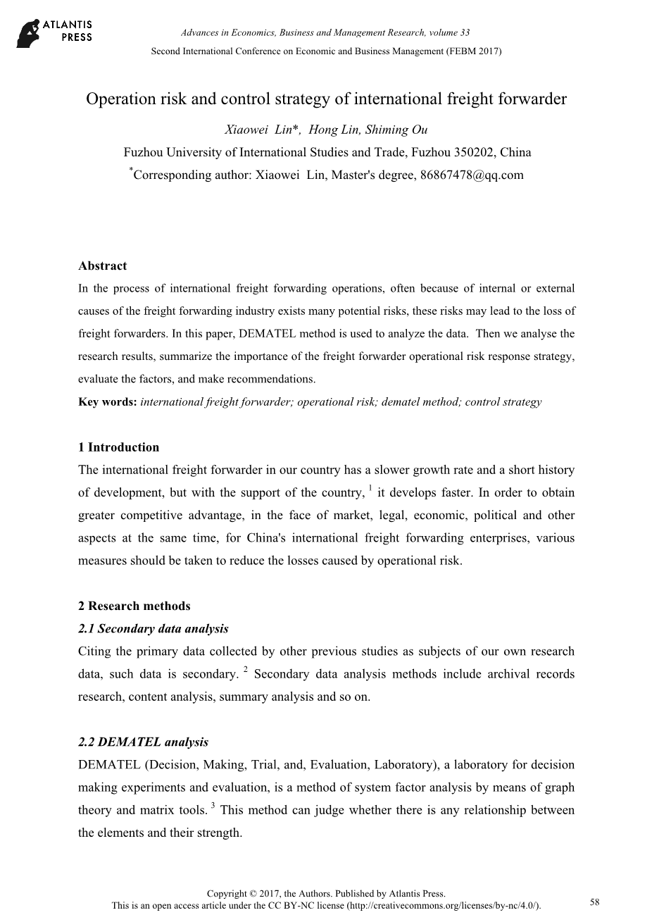 近年来,物流风险管理的研究主要集中在的不同领域。通常,物流风险关系被定义为“长期关系,在这种关系中,参与者通常进行合作,共享信息,共同规划甚至修改他们的业务实践,以提高联合绩效。”物流风险管理的理论研究伴随着国际工程建设市场的形成和发展。目前,由于物流项目的投入和建设,物流建设还处于新生阶段,已有一批物流建设项目成功运营,但地理分布有限。这是因为物流投资从前期准备到后期运营需要很长一段时间。因此,对于物流建设项目的定量分析与评价的研究文献成果有限。以下是对物流风险相关的集体风险研究的总结:Tranfield等人分析了物流园区建设中存在的主要特征和各种风险因素。针对物流园区建设的实际情况,对物流园区建设各阶段存在的明显风险进行了重新分析,并提出了相应的风险管理策略和防范措施。Fawcett等人考虑了城市与城市之间的物流关系以及物流园区在城市物流系统中的作用,提出了城市物流园区建设需要考虑的条件。针对物流园区建设中存在的问题,提出了相应的对策。针对大型物流项目投资大、风险高、针对性强的特点,Grawe在《物流项目风险评估应用》中对物流风险进行了评估。第一个层次是将物流项目的投资、建设和运营中的各种风险因素作为一个整体来评估项目的风险水平。