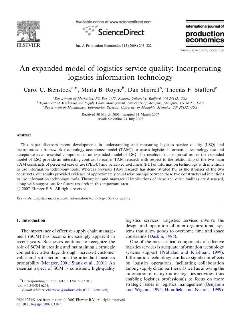 因此,本文的目的是重新审视不同文献中关于物流服务质量(LSQ)中信息技术的组织使用和接受,目的是开发一个综合模型,弥合这些文献的理论发展。为此,本文的内容如下:首先,我们回顾了有关LSQ的文献。其次,我们展示了信息系统的关键性质和公司用户技术接受理论,为我们扩展的LSQ模型提供了基础。第三,我们讨论了我们扩展的LSQ模型的实证检验的方法和结果。最后,我们确定研究结果的研究和管理含义,以及未来研究的结论,局限和方向。