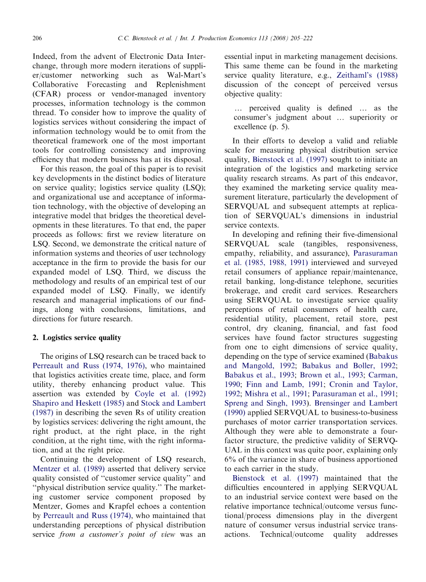 在努力开发有效和可靠的衡量物流服务质量的标准时,Bienstock等人(1997)试图启动物流和营销服务质量研究流程的整合。作为这项努力的一部分,他们研究了营销服务质量测量文献,特别是SERVQUAL的开发以及随后在工业服务环境中复制SERVQUAL维度的尝试。