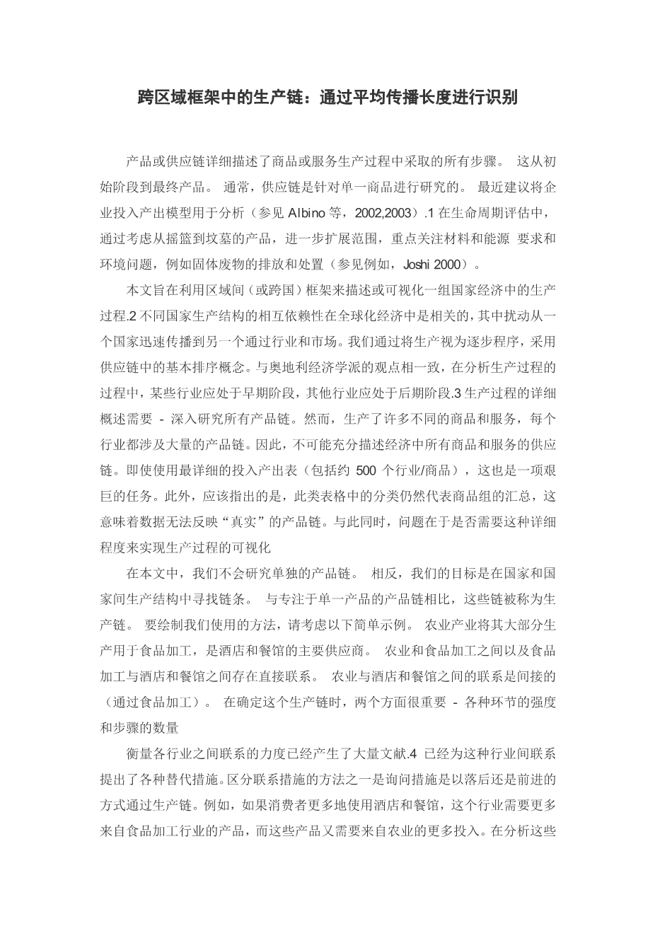 This paper aims to describe or visualize the production processes in a group of national economies using an interregional (or intercountry) framework.2 Interdependencies in the production structure of different countries are relevant in a globalized economy where perturbations quickly propagate from one coun- try to another through industries and markets. We adopt the underlying concept of sequencing in supply chains by viewing production as a stepwise procedure. Consistent with the ideas of the Austrian school in economics, some industries should be placed in an early stage and other industries in a later stage when ana- lyzing the production processes.3 A detailed overview of the production pro- cesses would require an in-depth study of all product chains. However, many different goods and services are produced, and each industry is involved in a large set of product chains. An adequate description of the supply chains of all goods and services in an economy is therefore impossible. Even if input–output tables at their most detailed level (which comprise some 500 industries/com- modities) were used, this would be a formidable task. Also, it should be noted that the classification in such tables still represents aggregates of groups of com- modities, implying that the data cannot reflect ‘‘true’’ product chains. At the same time, the question arises whether this level of detail is desirable to visua- lize the production processes.