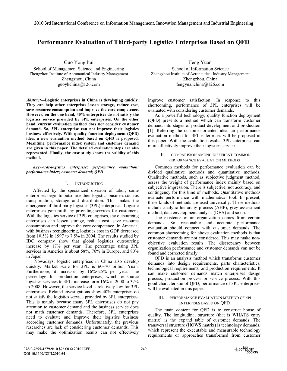 作为一个强大的技术,质量功能展开(QFD)提出了一种方法,可以将客户需求转换为产品开发和生产的阶段[1]。 指以顾客为中心理念,第三方物流企业绩效评价方法将在本文提出。 评价结果,第三方物流企业可以更有效地提高他们的物流服务。