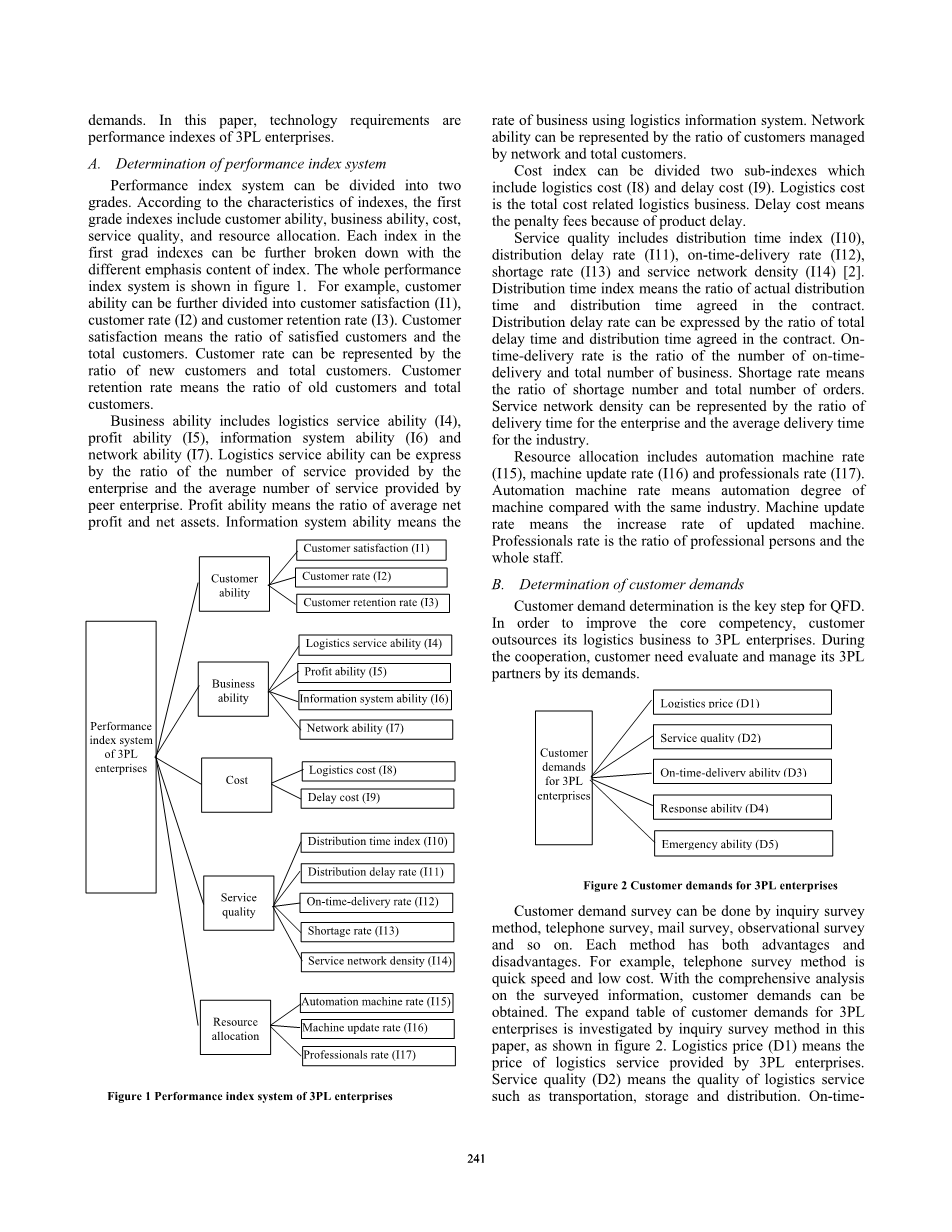 如今,物流企业也在中国发展迅速。 对3 pl市场规模60sim;70年数十亿元。 此外,它增加了16%sim;25%每年。 生产企业的比例,将物流服务外包给第三方物流,形成2000年的16%增加到2008年的37%。 然而,第三方物流企业的服务水平相对较低。 相关调查显示40%企业不满足第三方物流企业提供的物流服务。 这主要是因为许多第三方物流企业不注意客户需求和业务服务不数学客户需求。 因此,第三方物流企业需要评估和改善他们的物流业务根据客户要求。 不幸的是,之前的研究都缺乏考虑客户的需求。 这也许会使优化结果不能有效地提高客户满意度。 针对这个缺点,第三方物流企业的性能评估和考虑客户的需求。