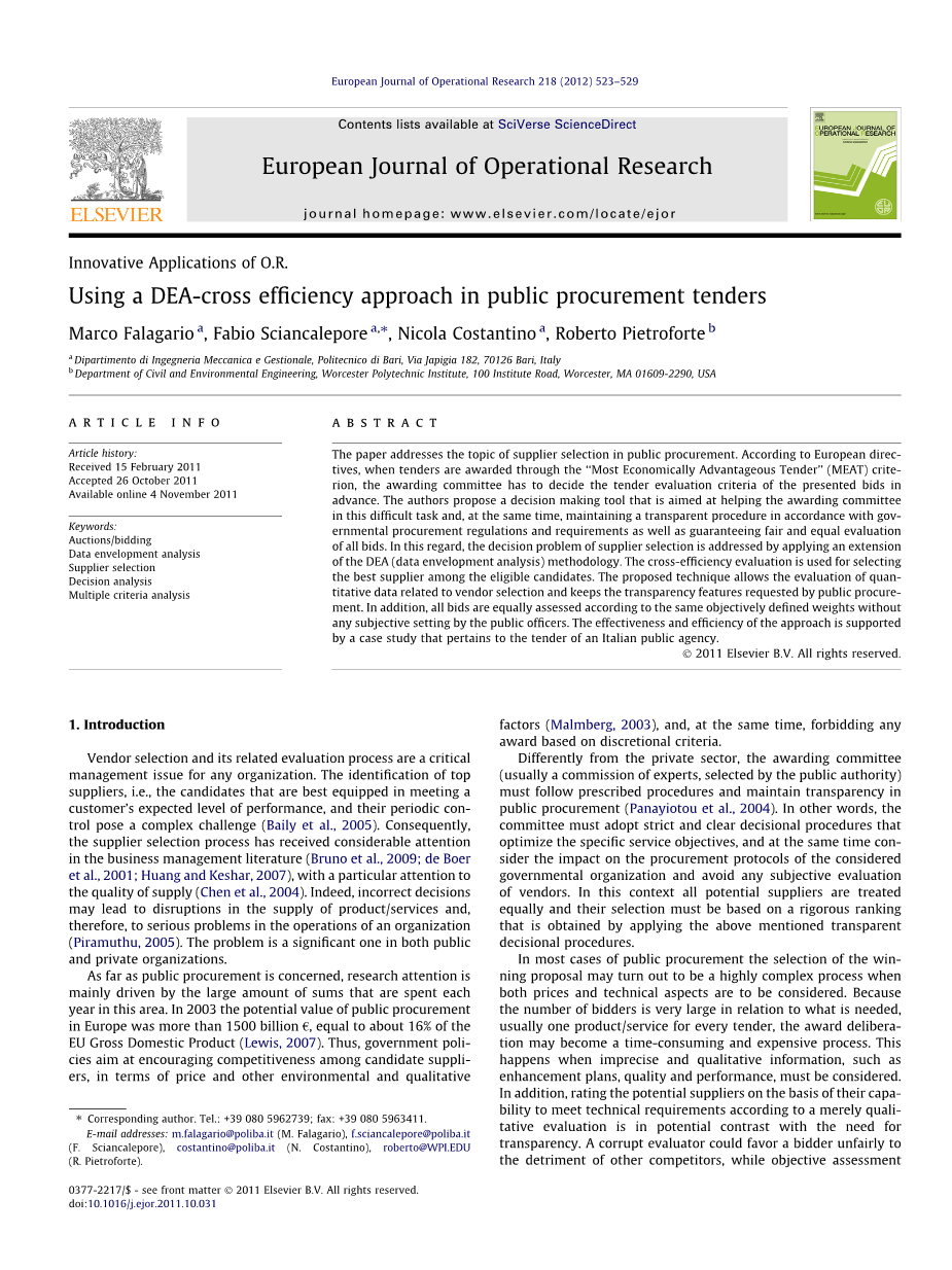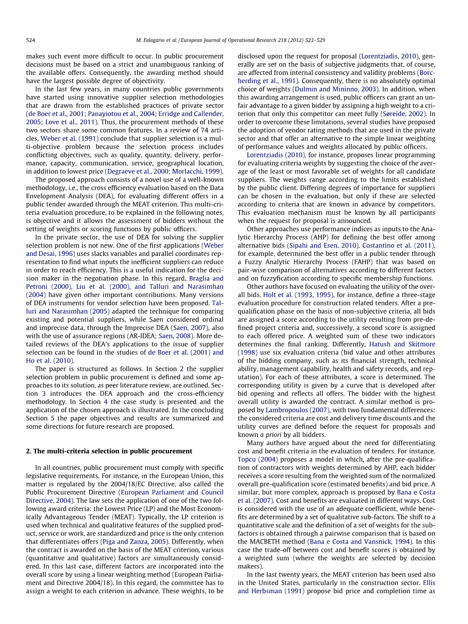 在过去几年中,在许多国家,公共政府已经开始使用创新的供应商选择方法,这些方法来自私营部门的既定做法(de Boer等人,2001; Panayiotou等人,2004; Erridge和Callender,2005; Love等人,2011)。因此,这两个行业的采购方式有一些共同特点。在对74篇文章的回顾中,Weber等人(1991)的结论是供应商选择是一个多目标问题,因为选择过程包括质量,数量,交付,绩效,能力,沟通,服务,地理位置等目标,以及最低的价格Degraeve等,2000; Morlacchi,1999)。所提出的方法包括使用众所周知的方法,即基于数据包络分析(DEA)的交叉效率评估,用于评估通过MEAT标准授予的公开招标中的不同报价。这个多标准评估程序,将在下面的注释中解释,是客观的,它允许评估投标人没有由公共设置权重或评分功能。