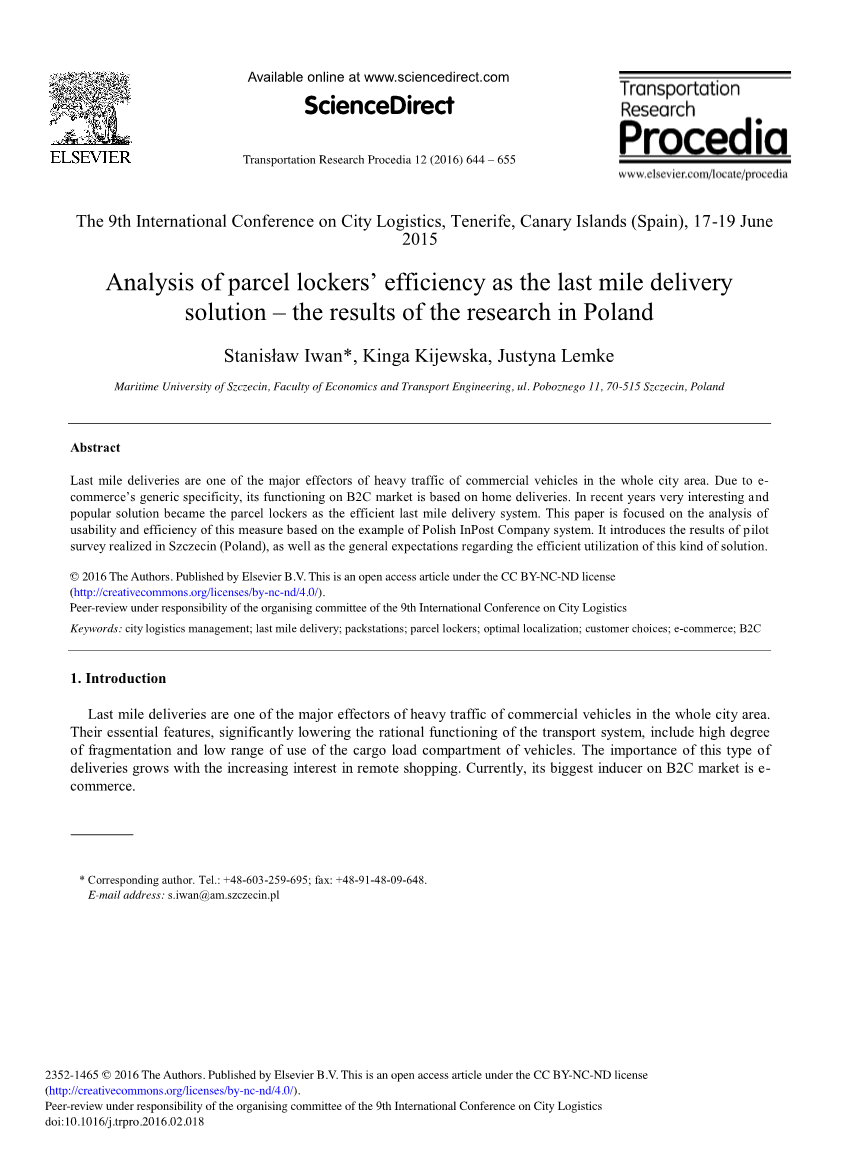 最后一公里交付是整个城市地区商用车交通拥挤的主要影响因素之一。 由于电子商务的通用性,特异性,使得B2C市场上的功能是基于家庭交付。在最近几年,包裹柜作为最后一公里的有效交付系统成为非常有趣和流行的解决方案。 本文基于波兰InPost公司系统的例子着重分析这一措施的可用性和效率。 本文介绍了在捷克(波兰)实现的试点调查的结果,以及对有效利用这种解决方案的一般预期。