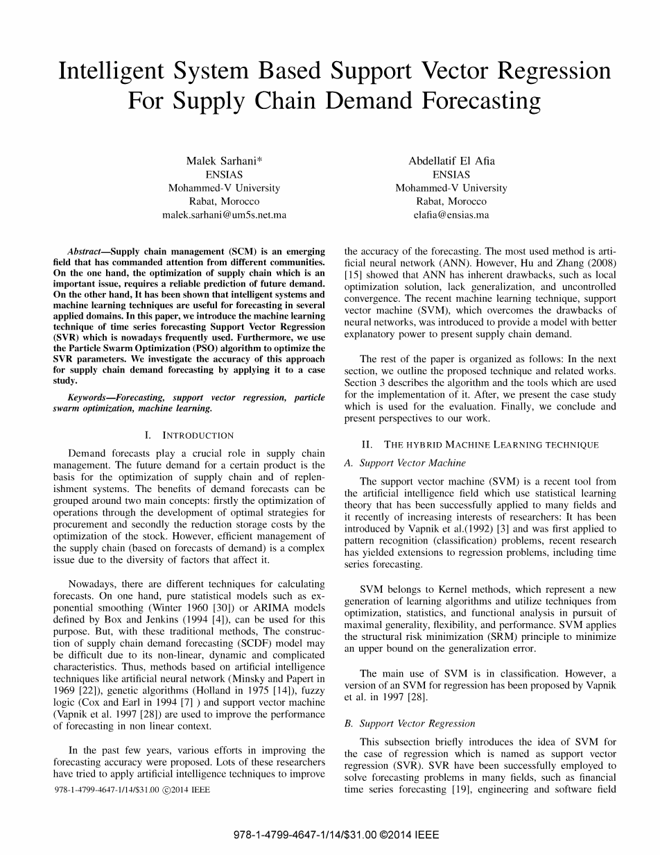 在本文中,我们研究了混合机器学习技术SVR-PSO在预测供应链需求方面的适用性。我们将其与SVR-GA模型进行比较。我们可以得出结论,选择PSO等算法可以提高选择SVR模型的w参数的准确性。