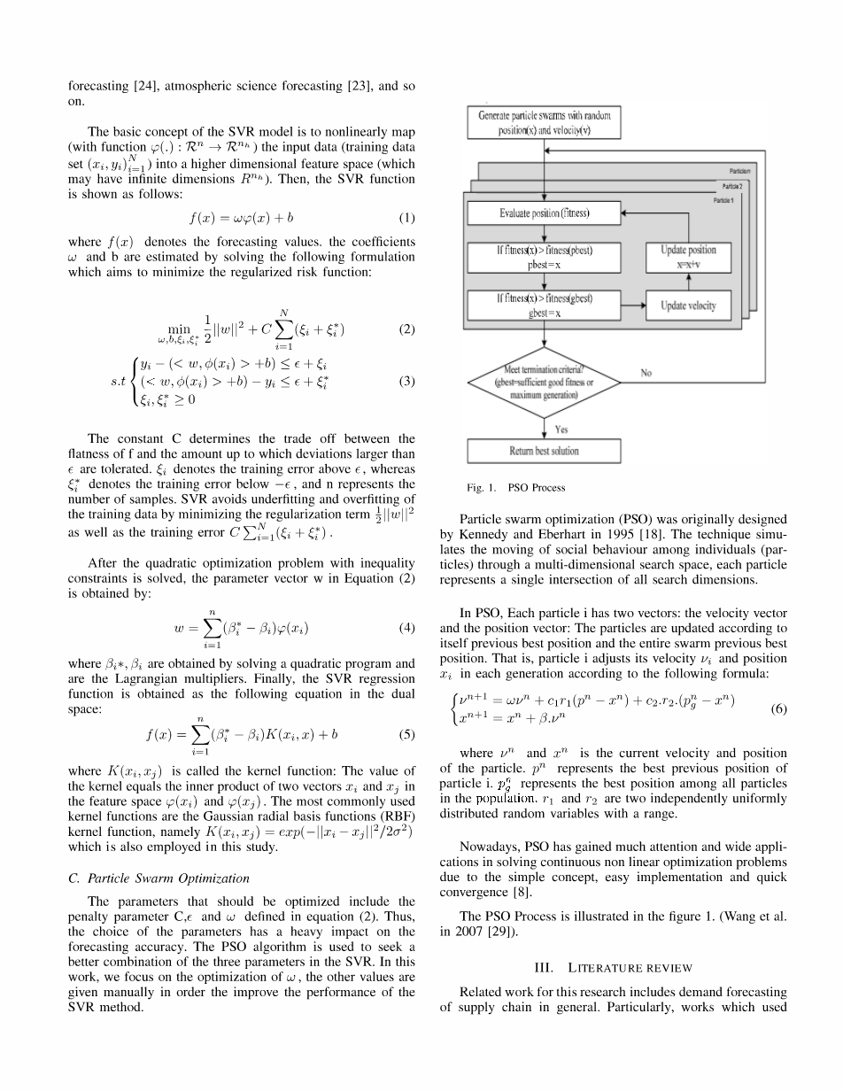 由于大多数需求(销售)数据在关系和复杂性方面都是非线性的,许多研究倾向于将SVR和PSO相结合的混合模型应用于时间序列预测。作为一个例子,Guo等人(2009)[13]定义了一种基于PSO-SVM与决策树相结合的方法,并将其应用于供应商选择问题。在Gang和Zhuping(2011)[9]的论文中,这种混合方法也被应用于交通安全预测。另外,Anandhi等人(2013)[2]在他们的论文中提出了一个适当调整的支持向量回归预测模型可以胜过其他更复杂的模型。特别地,他们表明使用PSO方法提出的SVM回归提高了准确性。