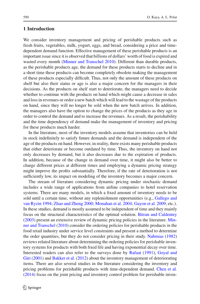 Benkherouf(1995)和Mishra和Singh(2010)考虑具有时间依赖性需求函数的易逝品的库存模型中的确定性需求,但它们只关注补货计划并没有考虑定价。Broekmeulen和van Donselaar(2009)还在考虑产品有效期的情况下关注易逝产品系统,他们提出了一个在不考虑定价的情况下补充易逝品库存的启发式的策略。他们将他们的启发式结果与没有考虑到使用模拟的库存有效期的最优策略进行比较。Transchel和Minner(2009)考虑具有确定性需求的非易逝品的离散定价,假定价格变化有固定成本。Abad(1996)和Rajan和Steinberg(1992)通过允许周期内的连续价格函数p(t)来考虑定价和易逝品订购决策之间的关系。Abad(1997,2001,2003)针对具有确定性需求的易逝品实现最优定价和批量大小问题,从而允许系统中的单一价格。Burwell等人(1991)通过除了所有单位数量折扣之外还提供缺货来扩展Abad(1997)的结果。Wee(1999)已经制定了针对易逝品的联合定价和补货策略,其有效期遵循威布尔分布,部分延期交货和数量折扣,但他只考虑一个单一的价格,不允许价格变化。同样的,Mukhopadhyay等人(2004)和Sana(2010)也考虑了易逝品,假设在整个周期内收取单一价格而不允许在一个周期内进行价格变动。另外,他们假定需求函数与时间无关。You(2005)处理具有价格和时间相关需求的易逝品库存模型,并且目的是在假定价格变化之间具有固定时间间隔的情况下,确定最优数量的价格,价格值和订单数量。
