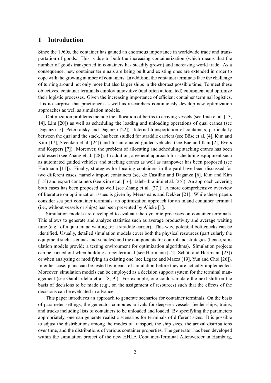 自二十世纪六十年代以来,集装箱在全球贸易和货物运输方面已经非常重要,这是由于集装箱化程度不断增加(这意味着集装箱运输的货物数量稳步增长)和国际贸易的增加。因此,为了应对越来越多的集装箱,需要不断新建新的集装箱码头,并扩大现有的集装箱码头。此外,集装箱码头也面临着在最短时间内尽可能周转而且换用更大的船只的挑战。为了实现这些目标,集装箱码头采用创新(通常是自动化)设备并优化其物流流程,鉴于高效集装箱码头物流的重要性日益增加,实验人员和研究人员不断开发新的优化方法和模拟模型,这一点并不奇怪。