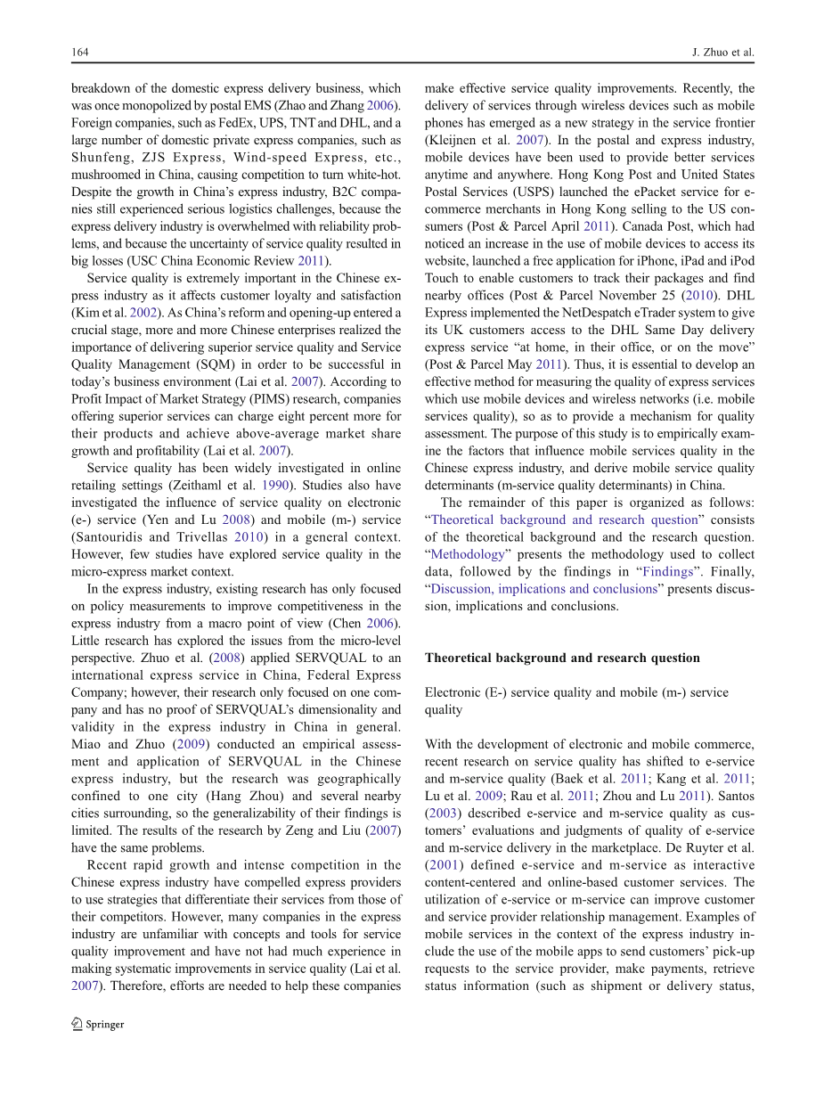 随着电子和移动商务的发展,最近对服务质量的研究已经转向电子服务和服务质量(Baek et al. 2011; Kang et al. 2011; Lu et al. 2009; Rau et al. 2011; Zhou and Lu 2011). Santos(2003)描述了电子服务和服务质量作为客户对市场中电子服务和m服务交付质量的评估和判断。De Ruyter等(2001)将电子服务和m服务定义为以内容为中心的互动和在线客户服务。电子服务或m服务的利用可以改善客户和服务提供商的关系。移动服务的例子包括使用移动应用程序将客户的接听请求发送给服务提供商,进行付款,检索状态信息(如装运或交付状态,付款状态,签名状态等等),并获得客户服务。另外还包括发送订单跟踪短信,关于付款和订单提取的提醒以及指定的人员批准以签署交货单。