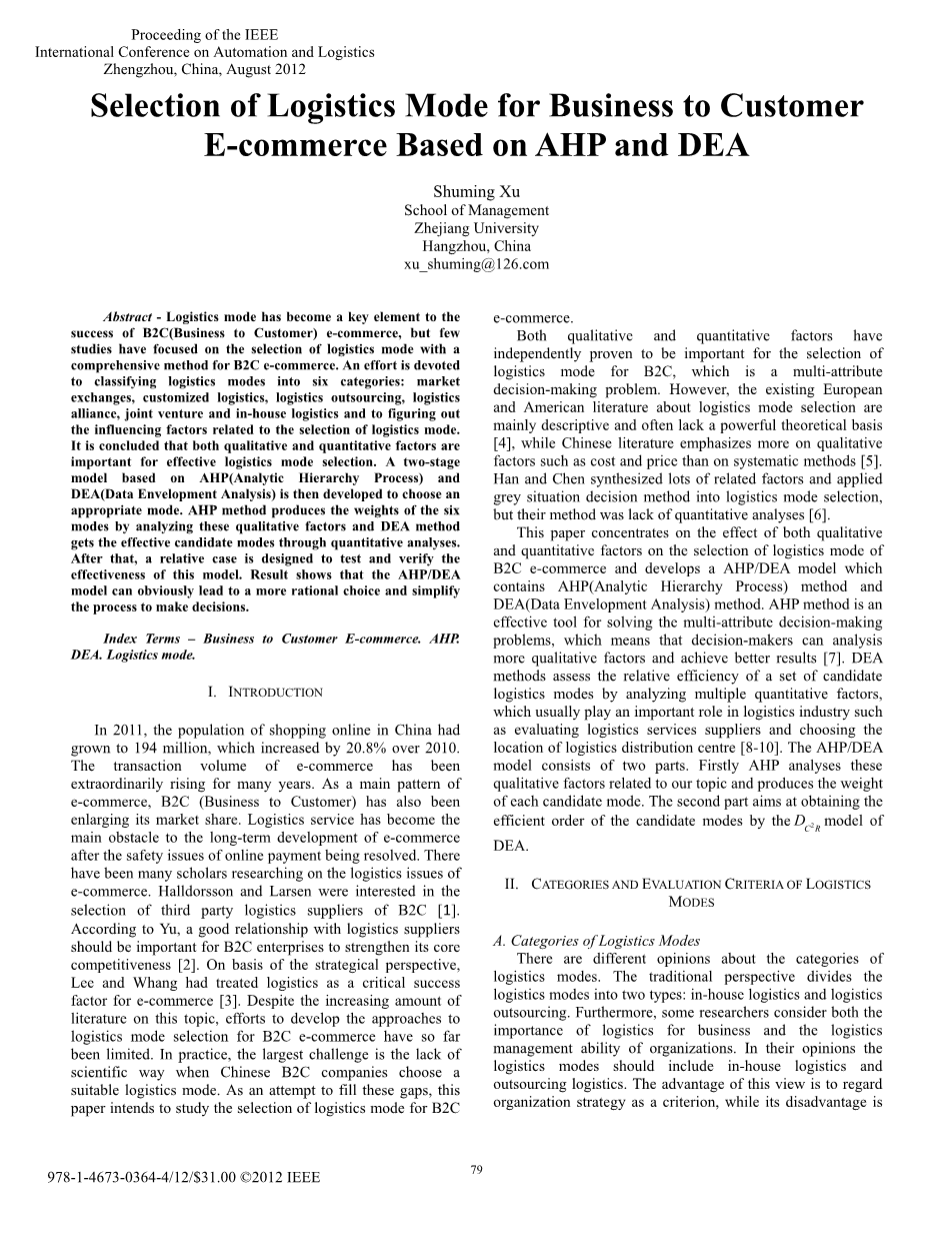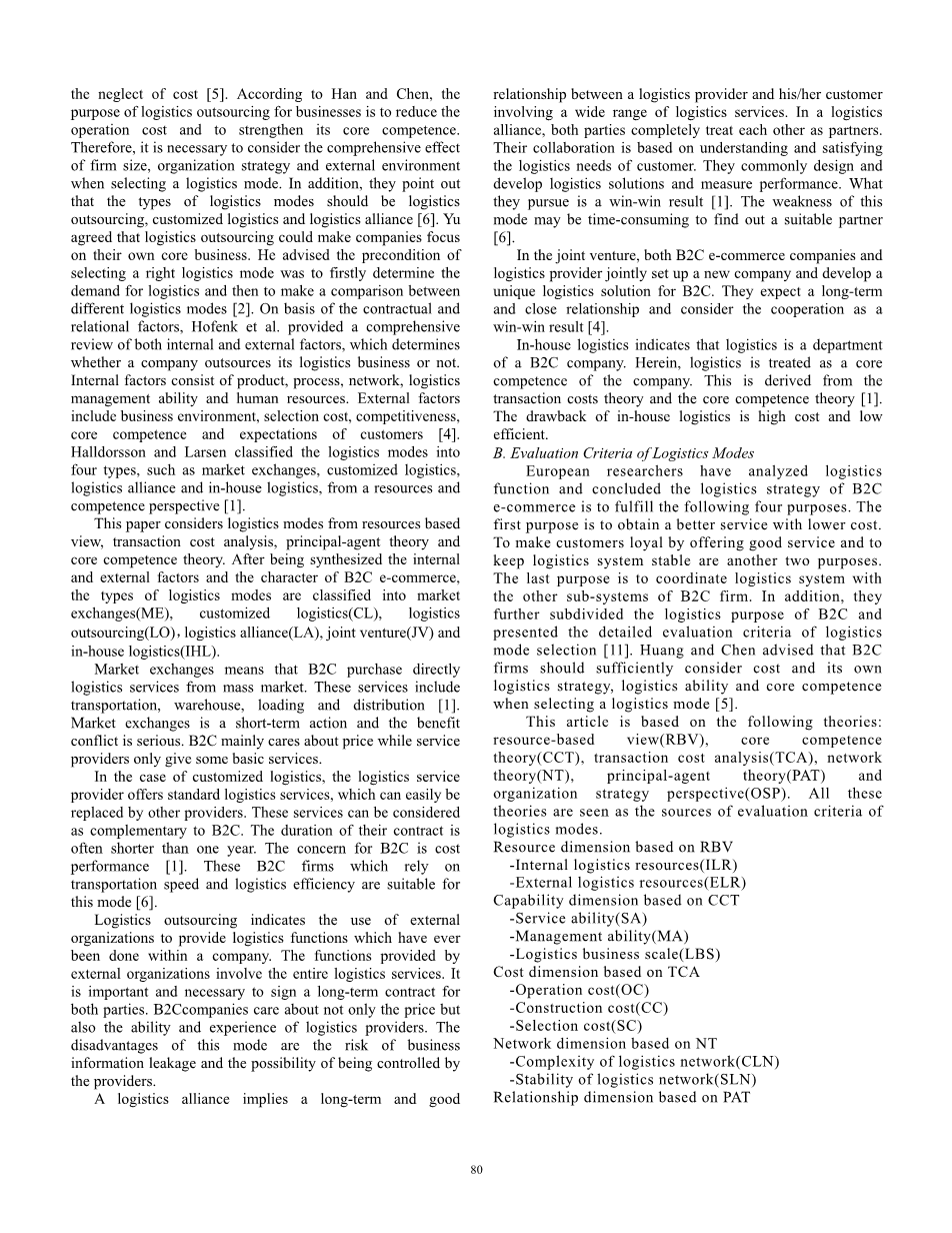 2011年,中国在线购物人数已增至1.94亿,较2010年增长20.8%。电子商务交易量多年来显着上升。作为电子商务的主要模式,B2C(企业对客户)也在扩大其市场份额。物流服务已经成为解决网上支付安全问题后电子商务长期发展的主要障碍。有许多学者对电子商务的物流问题进行了研究。Halldorsson和Larsen对B2C第三方物流供应商的选择感兴趣[1]。据Yu介绍,与物流供应商的良好关系对于B2C企业加强其核心竞争力至关重要[2]。 从战略角度出发,Lee和Whang将物流视为电子商务的关键成功因素[3]。 尽管关于这一主题的文献数量不断增加,但发展B2C电子商务物流模式选择方法的努力迄今为止受到限制。 在实践中,最大的挑战是中国B2C公司选择合适的物流模式时缺乏科学的方式。 为填补这些空白,本文拟研究B2C电子商务物流模式的选择。