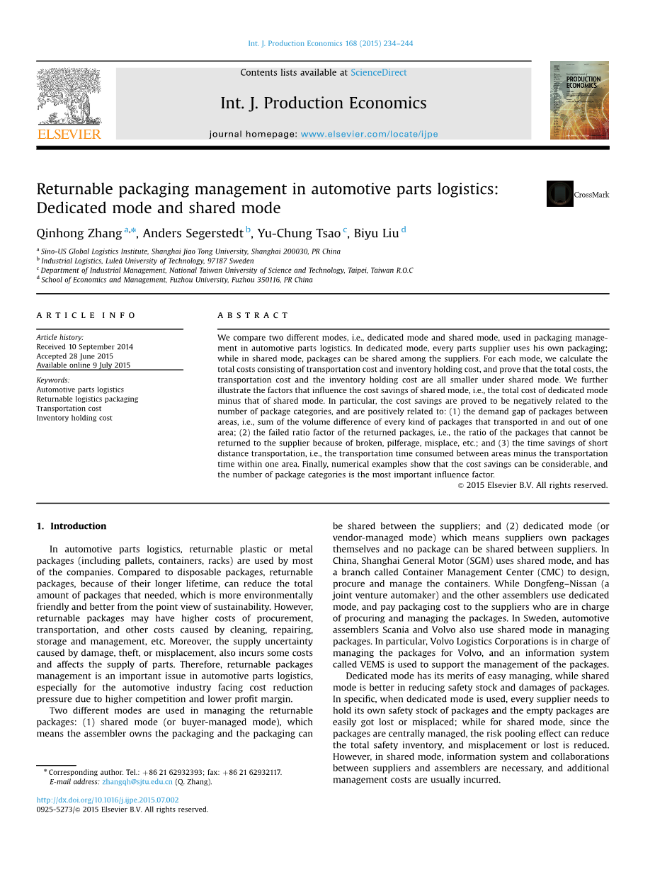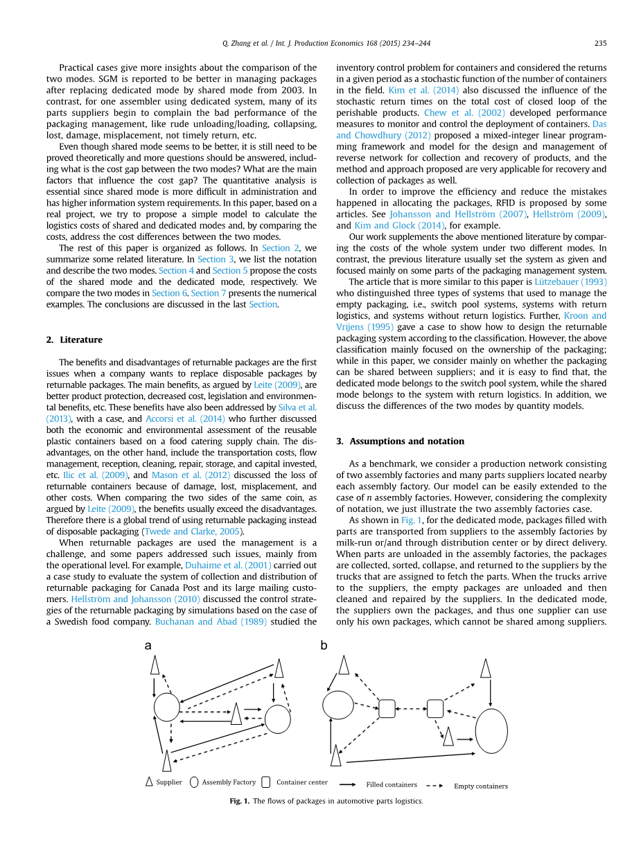 个重要问题,特别是对于竞争激烈、利润率较低、面临成本降低压力的汽车行业来说更是如此。在管理可回收的包时使用了两种不同的模式:(1)共享模式(或买方管理模式),这意味着组装者拥有包装和包装在供应商之间共享;(2)专用模式(或供应商管理模式),即供应商自己拥有包,供应商之间不能共享包。在中国,上海通用汽车(SGM)采用共享模式,并拥有一个名为集装箱管理中心(CMC)的分支机构来设计、采购和管理集装箱。而东风日产(一家合资汽车制造商)和其他装配商使用专用模式,并向负责采购和管理包装的供应商支付包装费用。在瑞典,汽车装配商斯堪尼亚(Scania)和沃尔沃(Volvo)也在管理软件包时使用共享模式。特别是,沃尔沃物流公司负责管理沃尔沃的包,并使用一个名为VEMS的信息系统来支持包的管理。 专用模式具有易于管理的优点,而共享模式在减少安全库存和包损坏方面效果更好。具体来说,当使用专用模式时,每个供应商都需要持有自己的安全库存,而空包很容易丢失或放错位置;而对于共享模式,由于包是集中管理的,所以风险池效应可以减少总安全库存,减少错误或丢失。然而,在共享模式下,信息系统和供应商和装配商之间的协作是必要的,并且通常会产生额外的管理成本。实践案例对两种模式的比较提供了更多的见解。据报道,SGM在2003年用共享模式取代专用模式后,在管理包方面做得更好。相比之下,对于一个使用专用系统的装配工,其许多零部件供应商开始抱怨包装管理的糟糕性能,如粗鲁的卸载/装载、崩溃、丢失、损坏、错位、不及时归还等。 虽然共享模式似乎更好,但仍需要理论证明,需要回答更多的问题,包括两种模式之间的成本差距是什么?影响成本差距的主要因素是什么?由于共享模式管理难度较大,对信息系统的要求较高,因此定量分析是必不可少的。本文在实际工程的基础上,尝试提出一个简单的模型来计算共享模式和专用模式的物流成本,并通过比较成本来解决这两种模式之间的成本差异。 本文的其余部分组织如下。在第二部分,我们总结了一些相关文献。在第3节中,我们列出符号并描述这两种模式。第4节和第5节分别提出共享模式和专用模式的成本。我们比较了第6节的两种模式。第7节给出了数值例子。最后一部分讨论了结论。