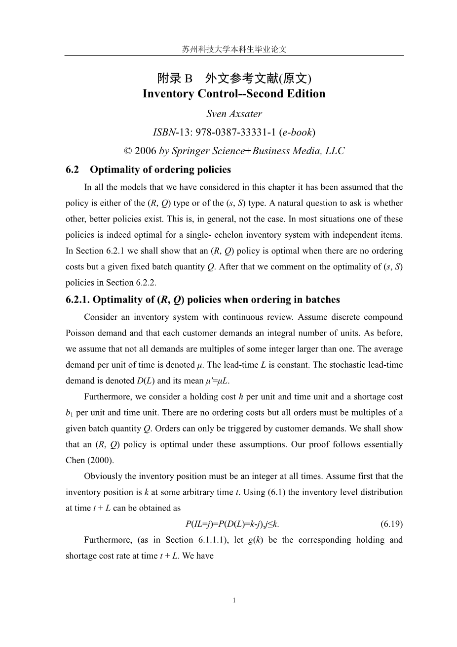 命题6.1可以被衍生成各种形式,例如其他成本结构和定期审查。在Q=1的特殊情况下,(RQ)策略退化为S=R 1的S策略。这意味着命题6.1也证明了在没有订购成本和没有约束的情况下S策略的最优性批量。