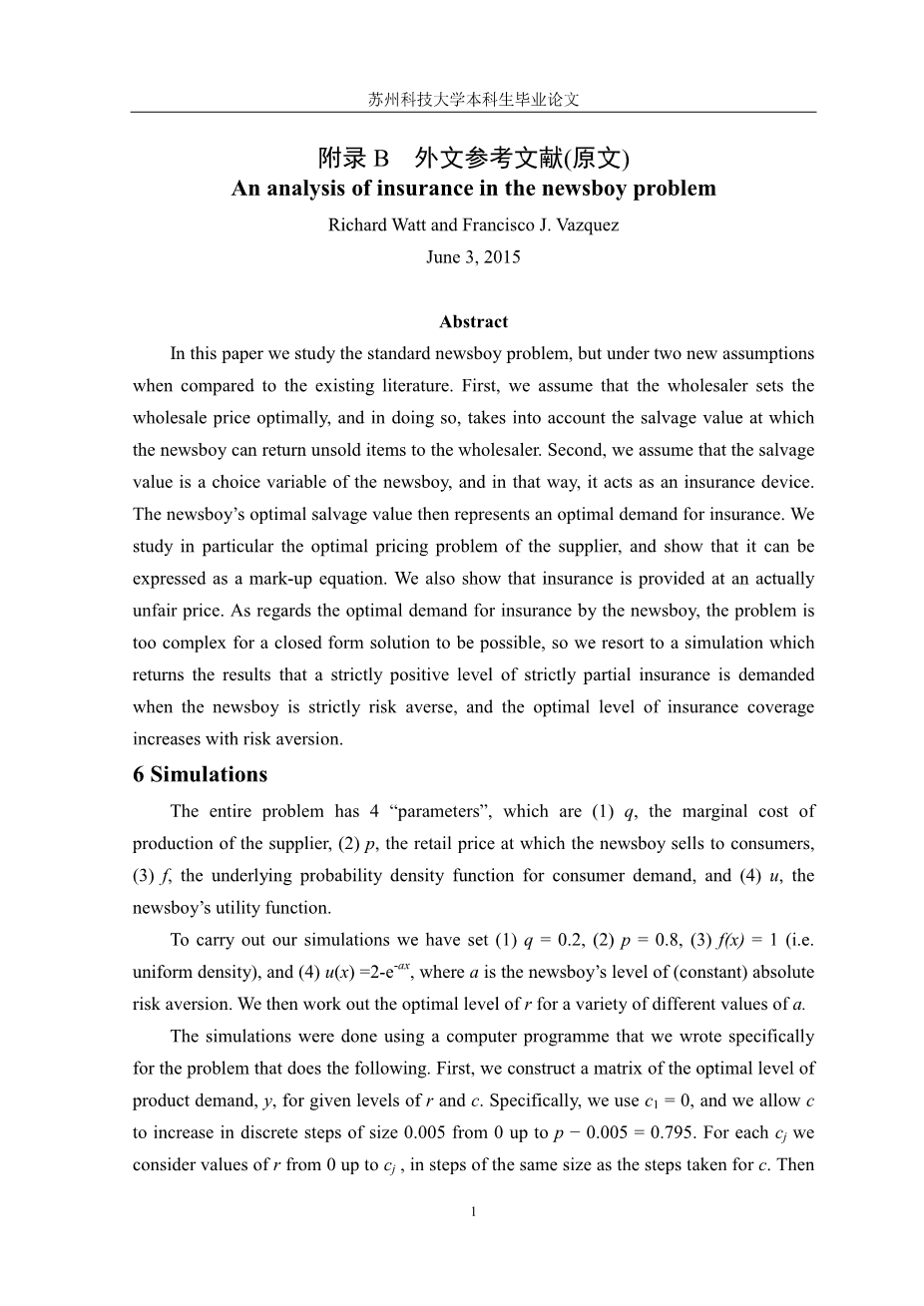 在本文中我们研究的是经典报童问题,但在与现有文献相比,本文有两个新的假设。首先,我们假设批发商最优地设置批发价格,并且这样做考虑了报童可以将未售出的报纸退还给批发商的剩余价值。其次,我们假设剩余价值是报童的一个选择变量,这样它就起到了保险的作用。报童的最佳剩余价值就代表了最佳的保险需求。我们特别研究了供应商的最优定价问题,并表明它可以表示为一个标记方程。我们还表明,保险是以精算不公平的价格所决定的。关于报童的最佳保险需求,问题太复杂了,一个现实的解决方案是不可能实现的,所以我们求助于一个模型,它返回的结果是当报童严格规避风险时候,严格部分保险的严格正面水平是被要求的,且最佳保险覆盖水平随风险规避的增加而增加。