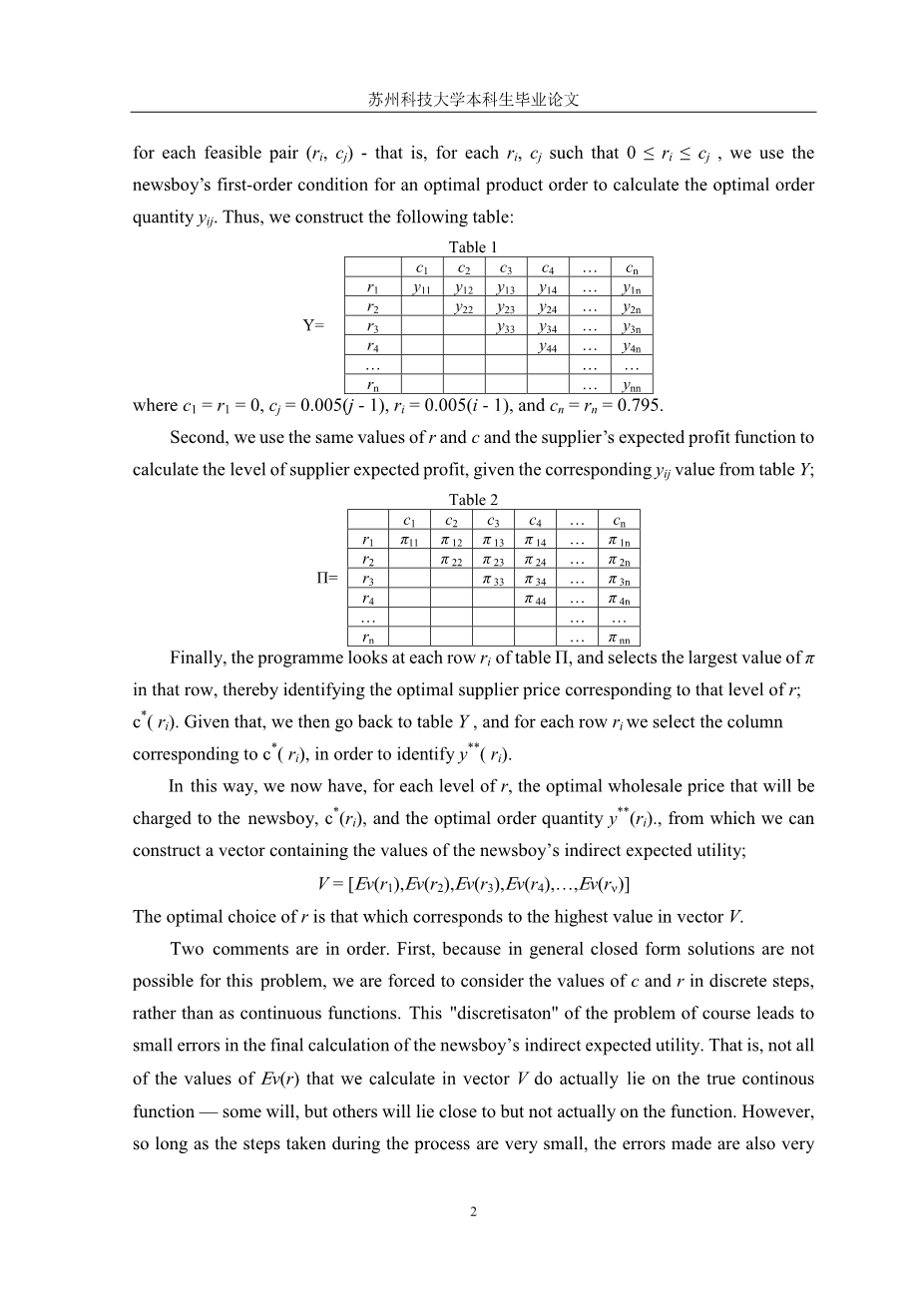 最后,程序查看表Pi;的每一行ri,并选择该行中最大的pi;值,从而确定与该级别r对应的最优供应商价格;c*(ri)。鉴于此,我们接着回到表y,并且对于每一行ri,我们选择对应于c*(ri)的列,以便识别y**(ri)。