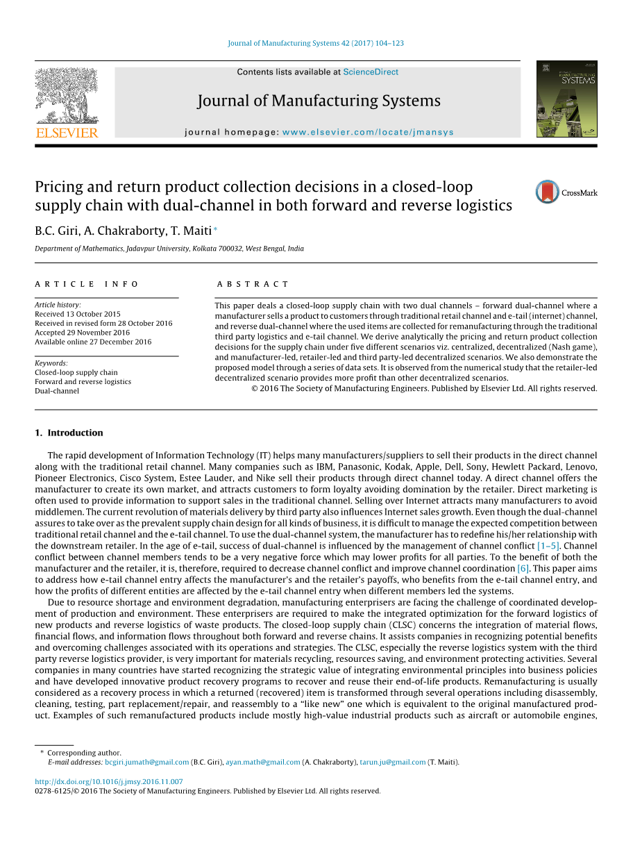 在闭环供应链中,制造商可以直接从消费者处回收旧产品。富士施乐公司、惠普公司、伊士曼柯达公司和其他一些公司都曾直接从消费者处回收旧产品。依据制造商的经验,通常由第三方(如GENCO Distribution System)来负责回收。同时,网络也成为消费者与制造商或零售商互动的新途径。也就是说,反向供应链上的双渠道可以像正向供应链上的双渠道一样有效。在本文中,我们提出一个包含正向双渠道和反向双渠道的闭环供应链模型。正向双渠道由一条传统零售渠道和一条制造商的电商渠道组成。反向双渠道由传统第三方或制造商(通过电商渠道直接回收产品)来运营。
