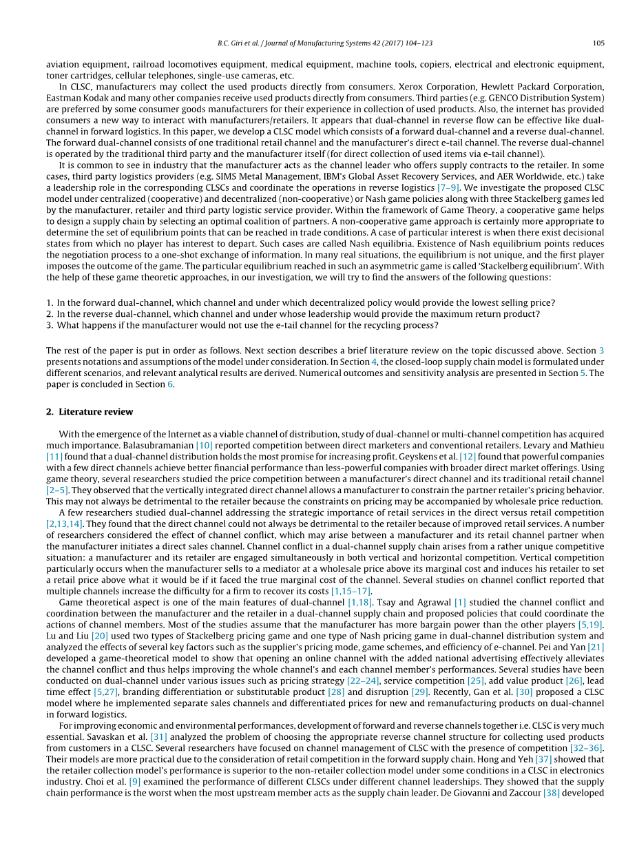 为了提高经济和环境效益,正向和反向渠道共同发展(如闭环供应链)是至关重要的。Savaskan等[31]分析了在闭环供应链中选择合适的反向渠道来从消费者手中回收旧产品的问题。一些学者还研究了有竞争情况下的闭环供应链管理[32–36]。他们的模型是基于正向供应链的零售竞争,因此更为可行。Hong和Yeh [37]的研究表明在电子产业,特定的情况下,零售商回收模式的效益比非零售商回