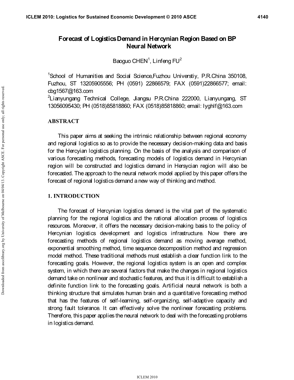 本文的目的在于探索区域经济和区域物流的内在联系,为海西物流规划提供必要的决策测数据和依据,在分析和比较各种预测方法的基础上,构建海西地区的物流需求预测模型并对其物流需求进行预测。本文提出的神经网络模型的方法,为区域物流需求的预测提供了一种新的思路和方法。