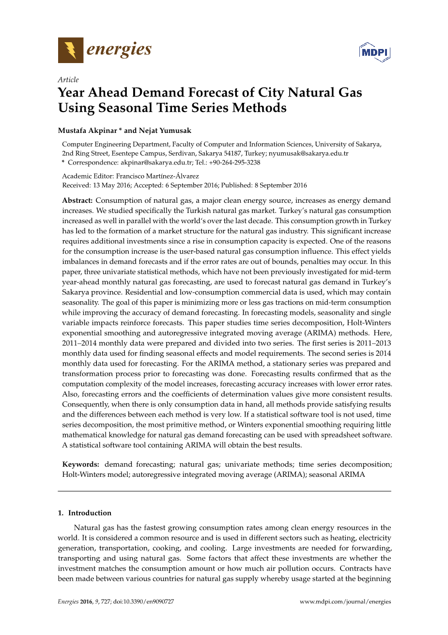 需求预测;天然气;单变量方法;时间序列分解;温特线性模型;自回归综合移动平均(ARIMA);季节性ARIMA
