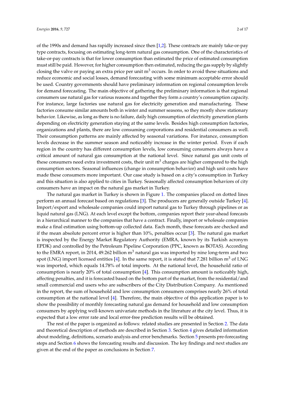 图1显示了土耳其的天然气市场,虚线上的公司根据规定执行年度预测[3]。生产者通常在土耳其境外[4]。进出口和批发公司可以通过管道或液化天然气(LNG)将天然气进口到土耳其。在除底层以外的各个层面上,公司都会以等级的方式向有合同的公司报告其年度预测。最后,进口或批发公司使用自下而上的收集数据做出最终估计。每月对这些预测进行检查,如果平均绝对百分比误差高于10%,则会出现惩罚[3]。能源市场监管局(EMRA,以其土耳其首字母缩写词EPDK称之)并由石油管道公司(PPC,称为BOTAS)控制天然气市场。根据EMRA的报告,2014年,9个长期和2个点(LNG)进口许可实体进口了49.2620亿立方米天然气[4]。在同一份报告中指出,进口的液化天然气有72810亿立方米,占总进口量的14.78%。在全国范围内,家庭消耗占总消耗的20%。这一消耗金额明显偏高,影响了处罚,并根据市场的底部进行了预测,从城市分销公司的订户和小型商业终端用户那里进行了预测。如报告所述,家庭和低消耗消耗者的总和占国家总消耗的近26%[4]。因此,本文的主要目的是通过在城市层面上应用著名的单变量方法,来展示每月预测家庭和低消耗消耗者的天然气需求的可能性。因此,可以获得低错误率和局部无误差预测结果。